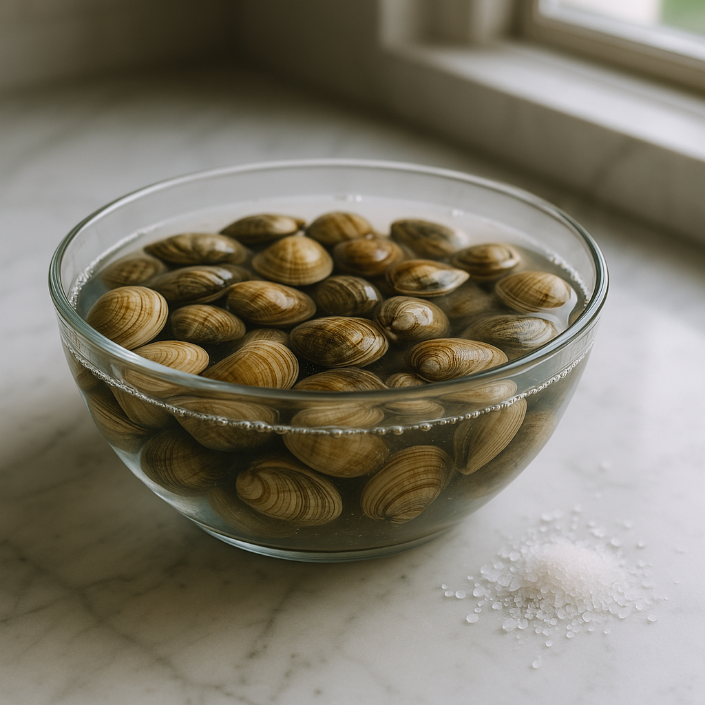 Soak the clams in salted cold water for 30 minutes to 1 hour to purge sand.